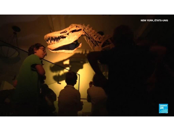 Un groupe d'enfants éclaire avec des lampes torches un fossile de tyrannosaure: la scène se déroule dans le musée d'histoire naturelle de New York, qui permet une fois par mois à des visiteurs de passer la nuit dans ses murs.