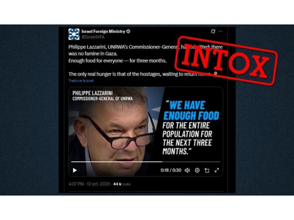 Selon les autorités israéliennes, le directeur de l’UNRWA, Philippe Lazzarini, aurait admis qu’il n’y avait pas de famine à Gaza : l’enclave disposerait d’assez de nourriture pour nourrir sa population pendant trois mois. Il s’agit de propos tronqués : le chef de l’UNRWA parlait de stocks situés à l’extérieur de Gaza.
