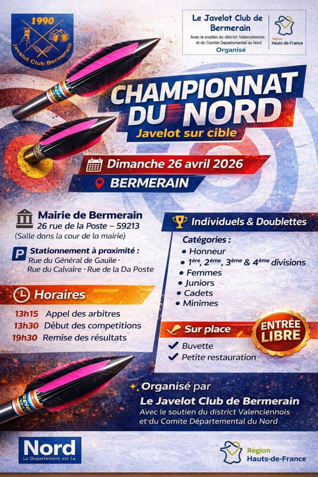 Le javelot Club de Bermerain organise avec le soutien du district Valenciennois et du Comité Départemental du Nord le championnat du Nord de javelot sur cible.