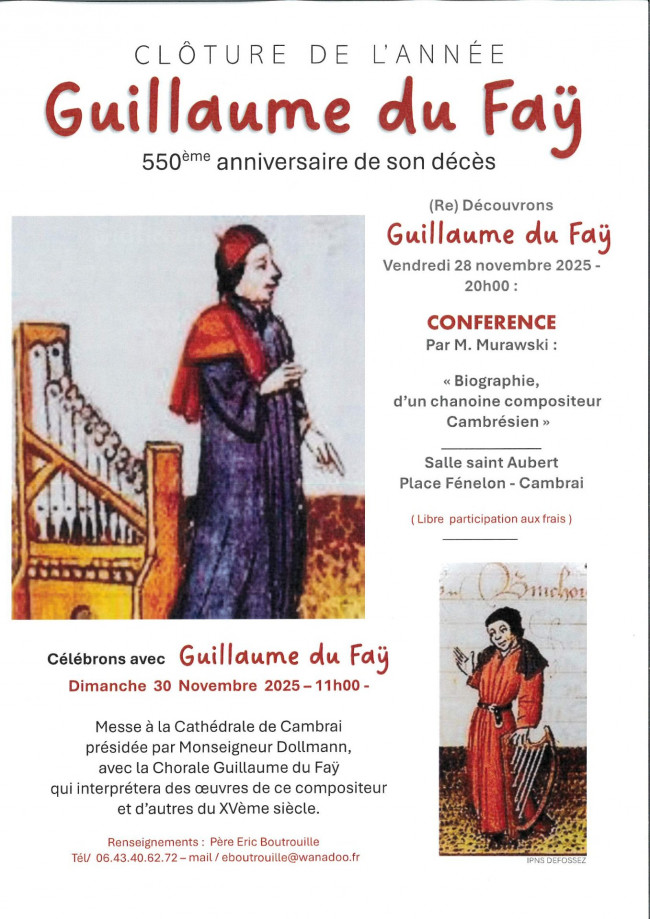 Célébrons avec Guillaume du Faÿ le dimanche 30 novembre à 11h, messe à la cathédrale de Cambrai présidée par Monseigneur Dollmann, avec la chorale Guillaume du Faÿ qui interprétera des oeuvres de ce compositeur et d'autres du XVème siècle. Renseignements : Père Eric Boutrouille 06.43.40.62.72 - mail : eboutrouille@wanadoo.fr