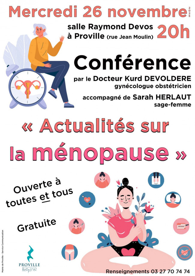 Mercredi 26 novembre à 20h à la salle Raymond Devos (rue Jean Moulin), la commune de Proville invite le Docteur Kurd DEVOLDERE, gynécologue obstétricien, accompagné de Sarah HERLAUT, sage-femme, pour parler de la ménopause et informer sur les dernières avancées en la matière.