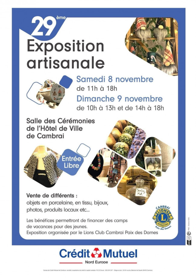 Le Lions Club Cambrai Paix des Dames organise son exposition artisanale le samedi 8 novembre 2025 de 11h à 18h, le dimanche 9 novembre 2025 de 10h à 13h et de 14h à 18h dans la salle des cérémonies de l’hôtel de ville de Cambrai