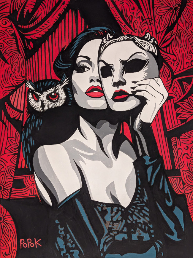 Quel que soit le médium, théâtre, dessin, peinture, ou photomontage, Popok poursuit une quête constante : faire naître des récits. Là où le théâtre racontait directement, ses créations visuelles suggèrent et invitent. Chaque image devient une porte ouverte vers une histoire à deviner, un univers à interpréter.