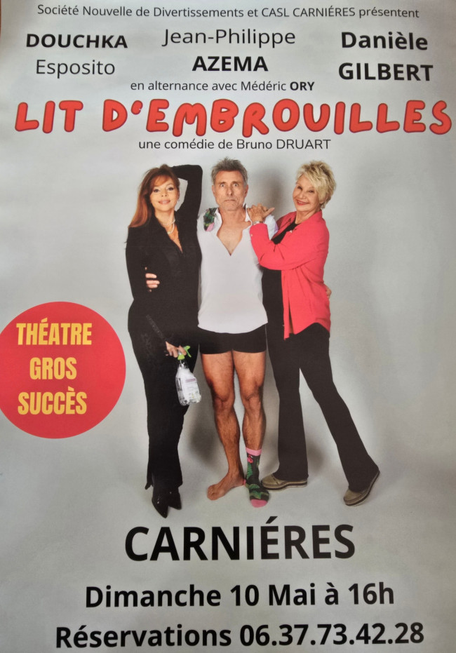 Le Club d’Animation Sociale et de Loisirs de Carnières (CASL) a le plaisir de vous inviter à assister à la pièce de théâtre « Lit d’embrouilles », avec Danielle Gilbert, Douchka Esposito et Jean-Philippe Azéma.Dimanche 10 mai 2026 à À 16h à la salle des fêtes de Carnières