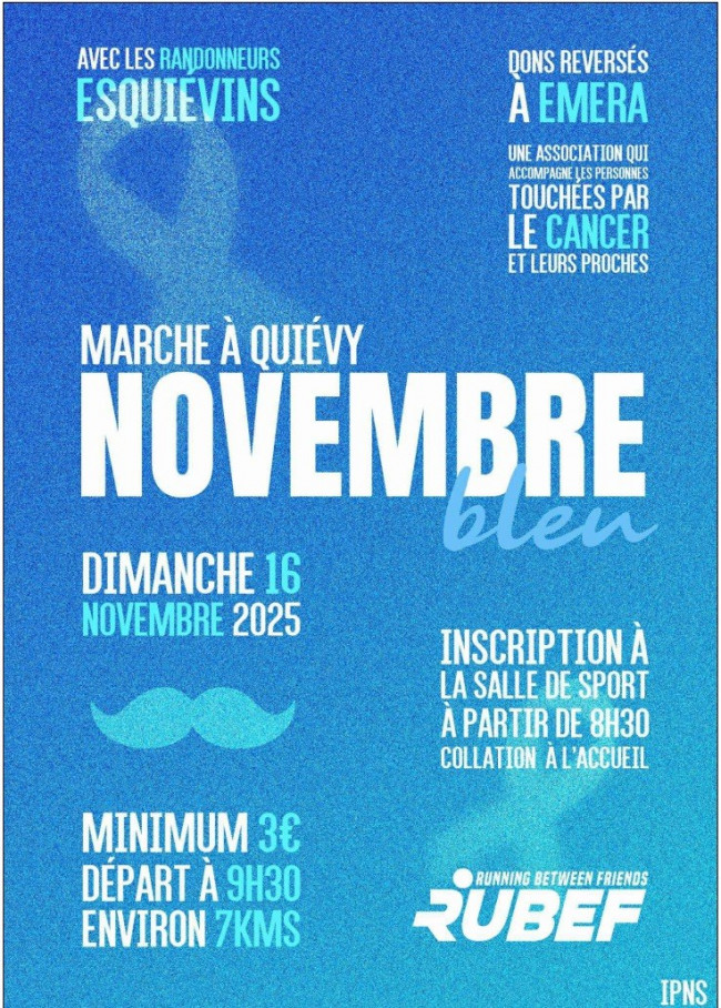 Enfilez vos baskets et rejoignez la marche organisée par les Rubef le 16 novembre prochain, dans le cadre de Novembre Bleu, une initiative de sensibilisation à la santé masculine, en particulier au dépistage du cancer de la prostate.