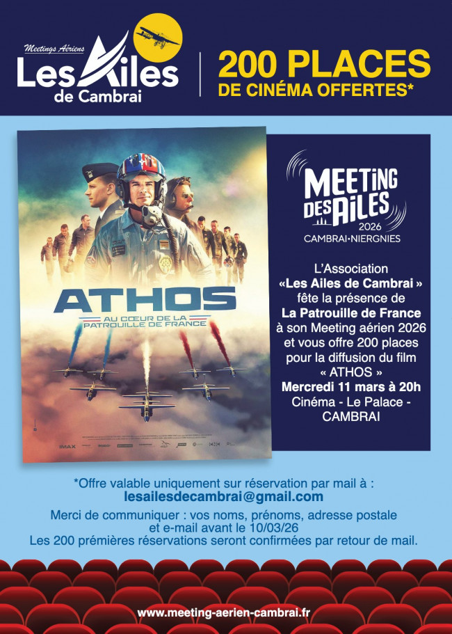 A l'occasion de la présence de la Patrouille de France au meeting aérien 2026, l'association les ailes de Cambrai propose la projection du film "Athos au coeur de la patrouille de France". Ce film sera diffusé au cinéma le Palace ce mercredi 11 mars à 20h. 200 places offertes : invitation gratuite à la projection uniquement sur réservation sur le mail : lesailesdecambrai@gmail.com Communiquez vos noms, prénoms, adresse postale et adresse mail avant le 10 mars 2026