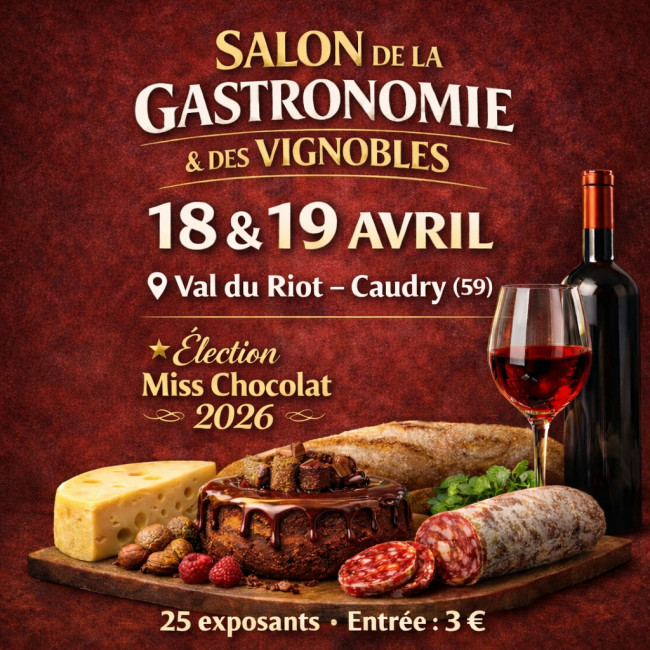 Salon de la Gastronomie & des Vignobles Les 18 et 19 avril, le Val du Riot à Caudry (59) accueillera le Salon de la Gastronomie & des Vignobles, un rendez-vous gourmand dédié aux amoureux des bons produits et du terroir.Pendant tout le week-end, partez à la découverte de 25 exposants passionnés venus partager leur savoir-faire et leurs spécialités :vins, produits artisanaux, douceurs chocolatées, spécialités régionales, charcuteries, fromages et bien d’autres trésors gourmands.Une belle occasion de déguster, échanger avec les producteurs et remplir son panier de produits authentiques dans une ambiance conviviale. Élection Miss Chocolat 2026 le dimanche